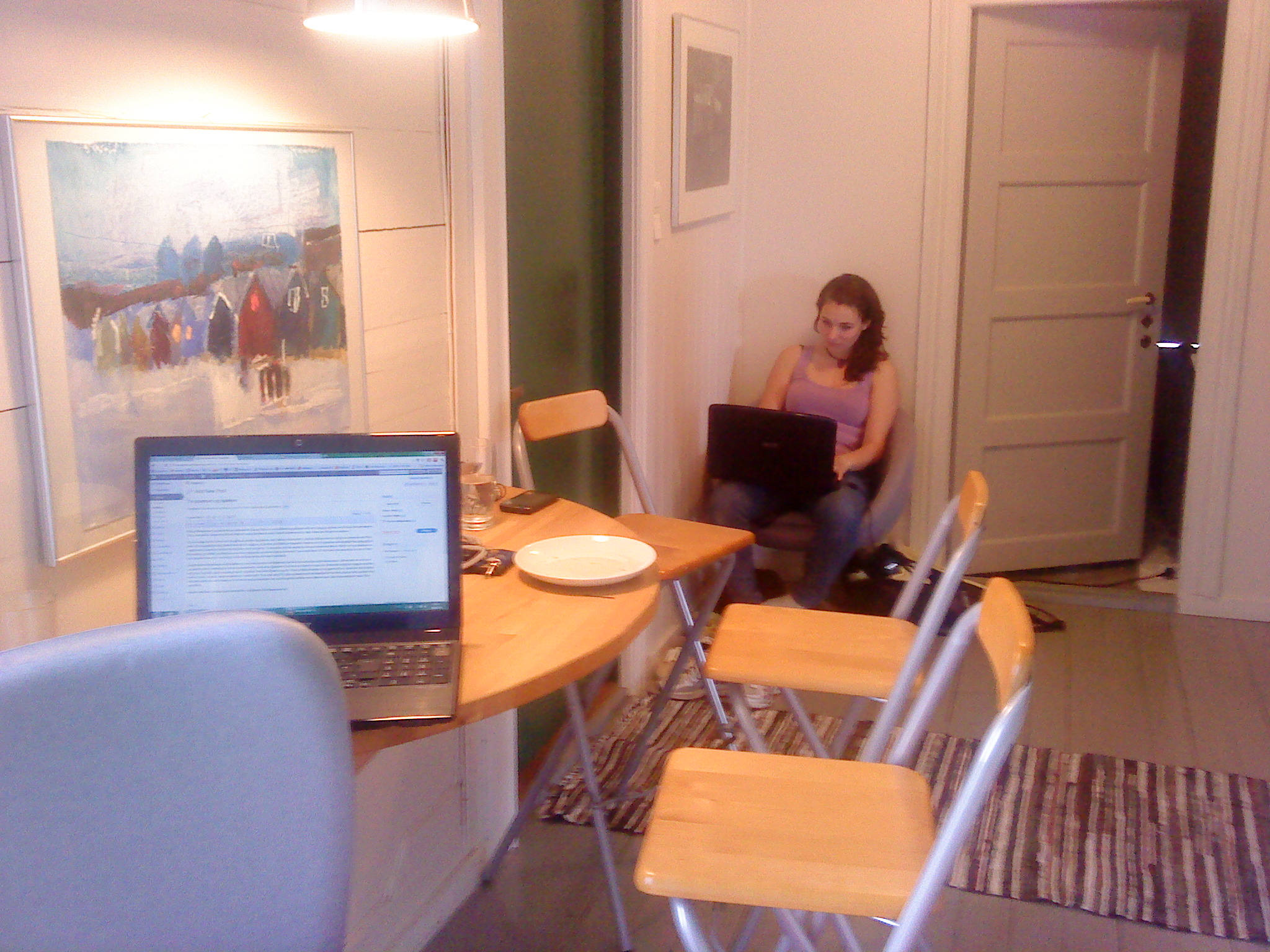 De siste dagene har vi hatt en vill og frustrerende lek gående, kalt “jakten på internett”. Jeg har tidligere nevnt at jeg har internett om PCen min står (i nøyaktig riktig vinkel) åtte cm fra veggen, og da kun på tilfeldige tidspunkt. Renate sin PC oppfatter selvfølgelig ikke internett på samme sted, men hun har funnet sitt lille sone i et hjørne. Vi fremstår nok litt patetiske i denne desperate jakten. Midt i en dyp samtale om fremtiden og verden og slikt kan en av oss hoppe opp og skrike “jeg har internett!”, noe som fører til vill jubel i det minuttet det varer. Men kun fra personen som var heldig, vi får sjeldent dette privilegiet samtidig.