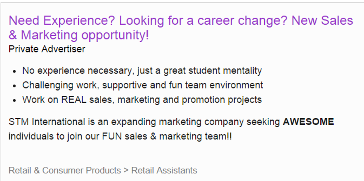 Jeg har lært meg den australske jobbannonsediskursen. Den følger i stor grad de samme reglene som jobbannonser på FINN.no. Jo mer AMAZING ATTITUDE du må ha, jo større er sannsynligheten for at du skal stå på et gatehjørne og selge omega-3. Jo mer utydelig det er hva jobben går ut på, jo sikrere er du på at jobben kan forklares med én setning.