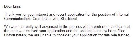 Som oftest får man aldri avslag på søknaden. Isteden hører man aldri noe, og må bare håpe at søknaden faktisk ble lest. Sånn er det jo også i Norge, og sikkert i de fleste andre land. The silent treatment blir sett på som dårlig skikk og feighet i datingverden, men i forholdet mellom arbeidsgiver og håpefull søker er det visst normen. Vil man vite sikkert, må man ringe et sentralbord og få avslag av en ille berørt ansatt.